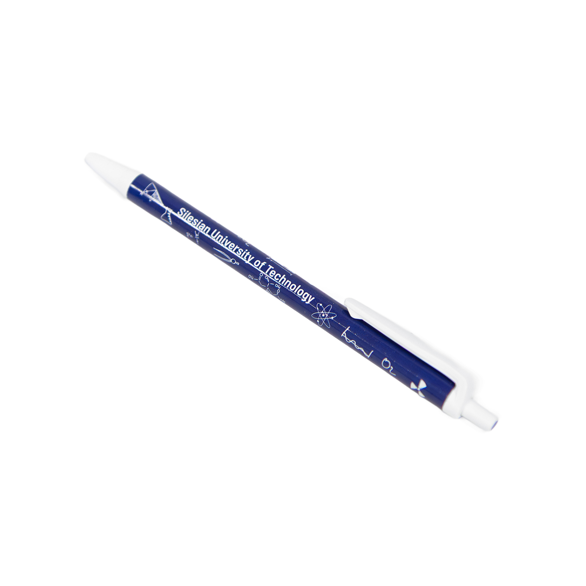Długopisy z okleiną dookoła korpusu z napisem Politechnika Śląska oraz Silesian University of Technology. Długopis wyposażony w wygodny mechanizm na przycisk, umożliwiający łatwe wysuwanie i chowanie wkładu.
