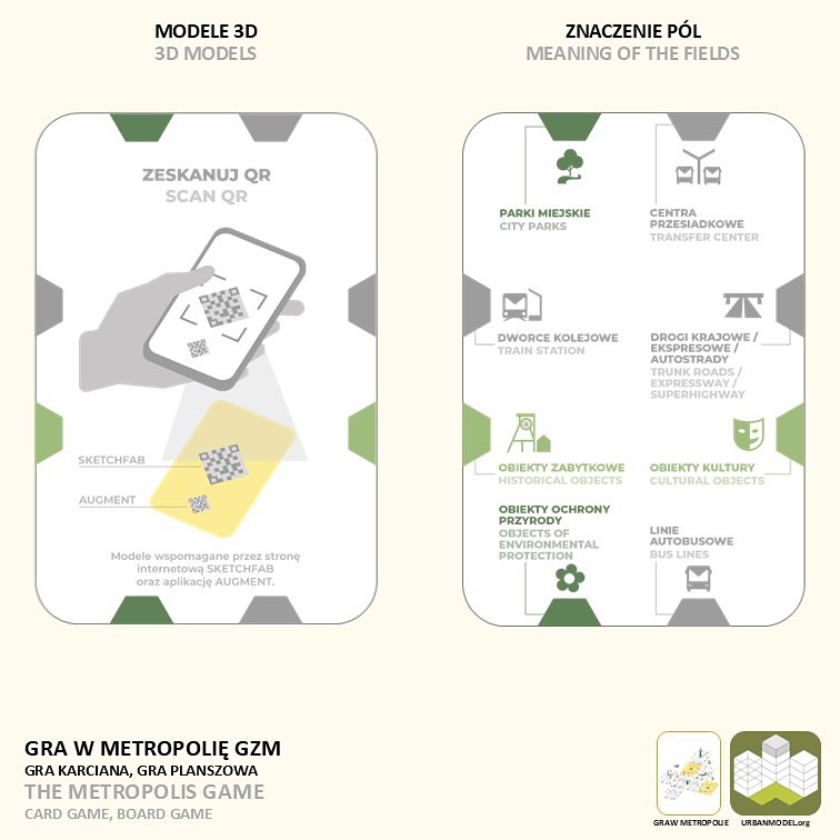 Gra została przygotowana dla odbiorców w każdym wieku. Oferuje klasyczną grę w karty, ułożenie mapy metropolii jak puzzli, wspomaga orientację, zawiera quizy i gry planszowe, które przybliżają wiedzę o GZM. Karty zawierają odwołania do lokalizacji, które można doświadczać w formie modeli 3D, także z wykorzystaniem rzeczywistości rozszerzonej. Każda z kart odwołuje się do rzeczywistej lokalizacji i reprezentuje wartości charakterystycznych wskaźników urbanistycznych: powierzchni, gęstości zaludnienia, ilości terenów zieleni oraz inne. GRA W METROPOLIĘ GZM demonstruje jej potencjał, a także uczy bawiąc.