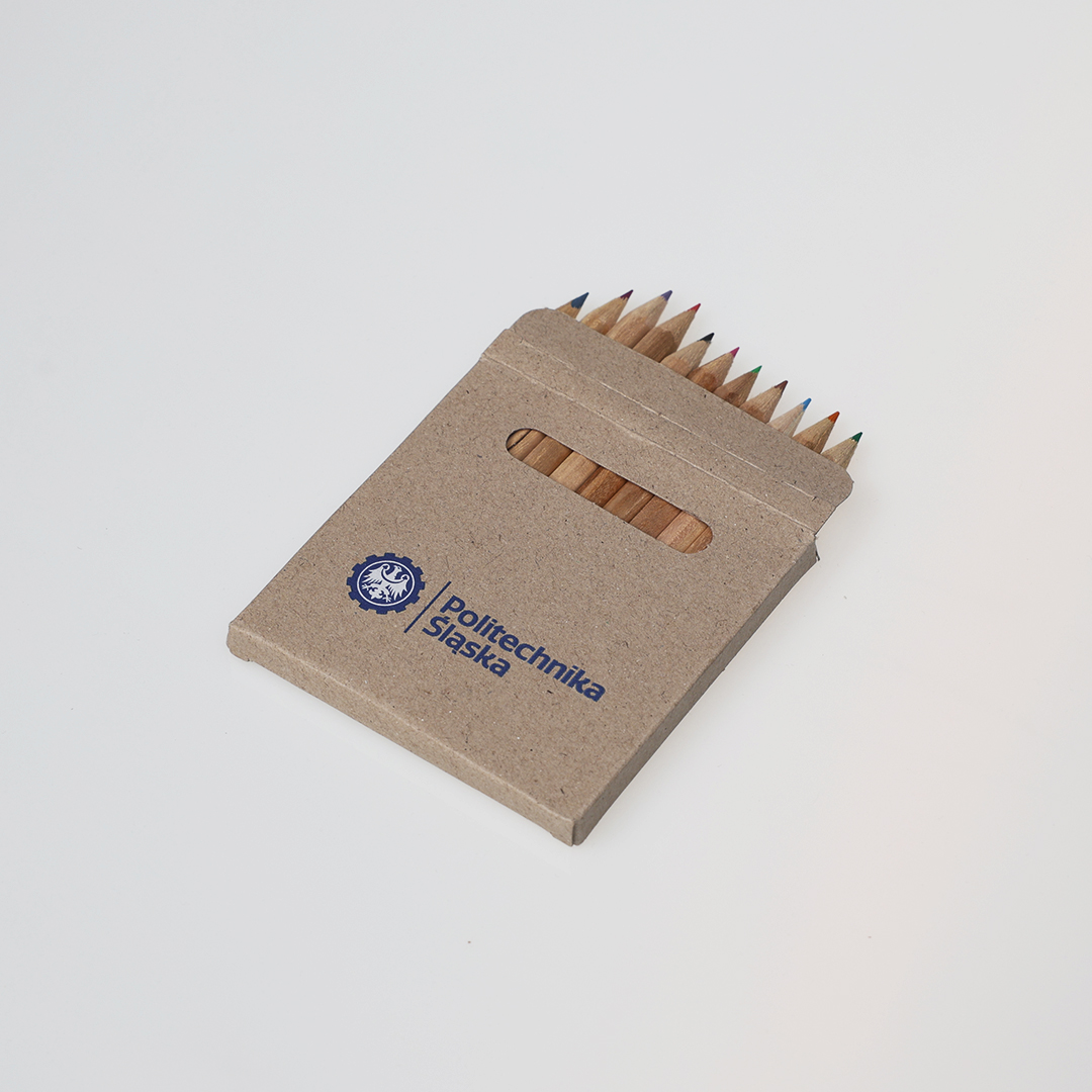 Zestaw kredek w kartonowym pudełku z logo Politechniki Śląskiej.