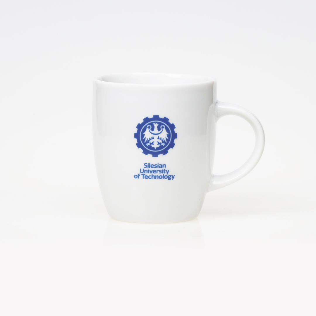 Biały kubek ceramiczny ze wzorami i logo Politechniki Śląskiej w języku angielskim.