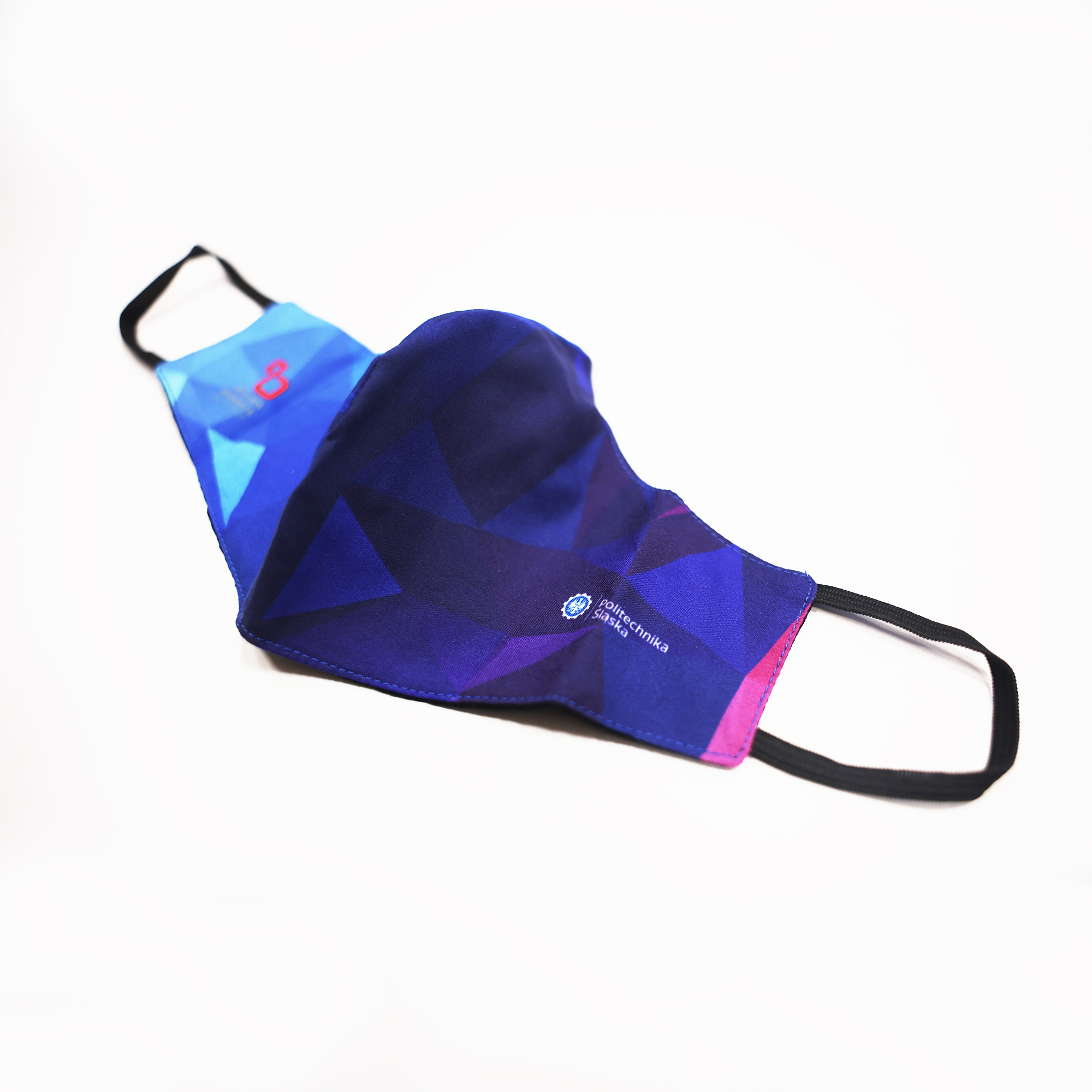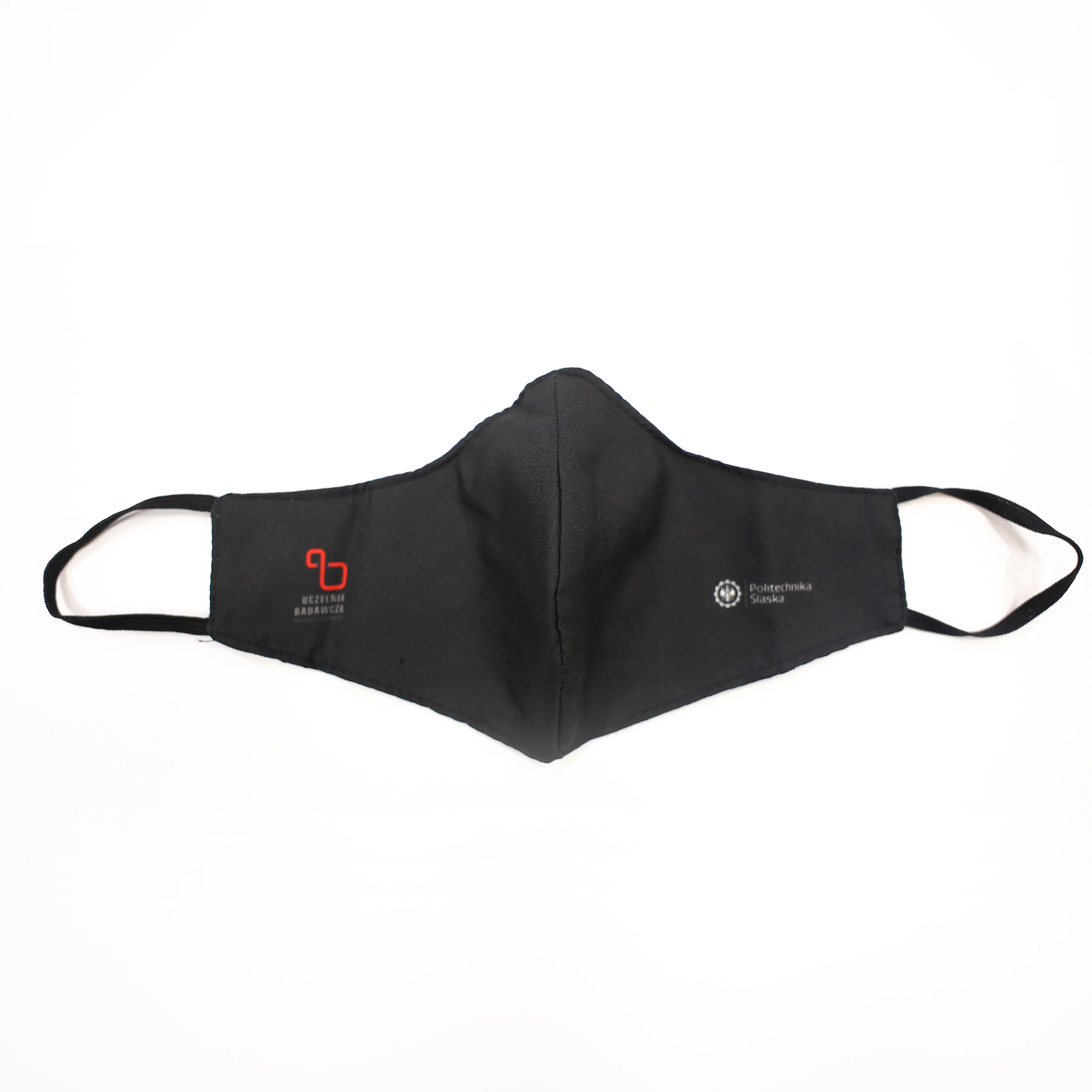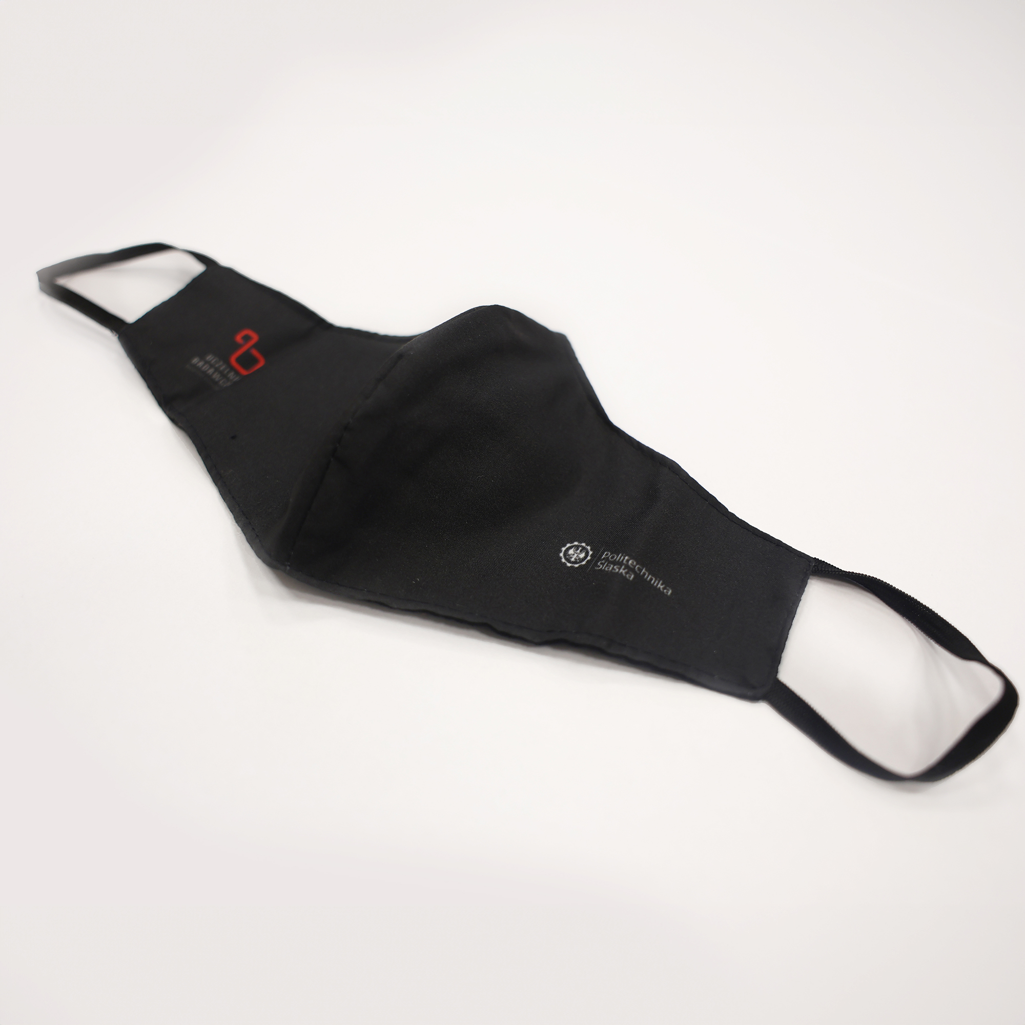 Maseczka ochronna z logo Politechniki Śląskiej oraz znakiem „Uczelnia Badawcza”
